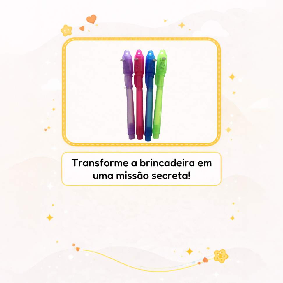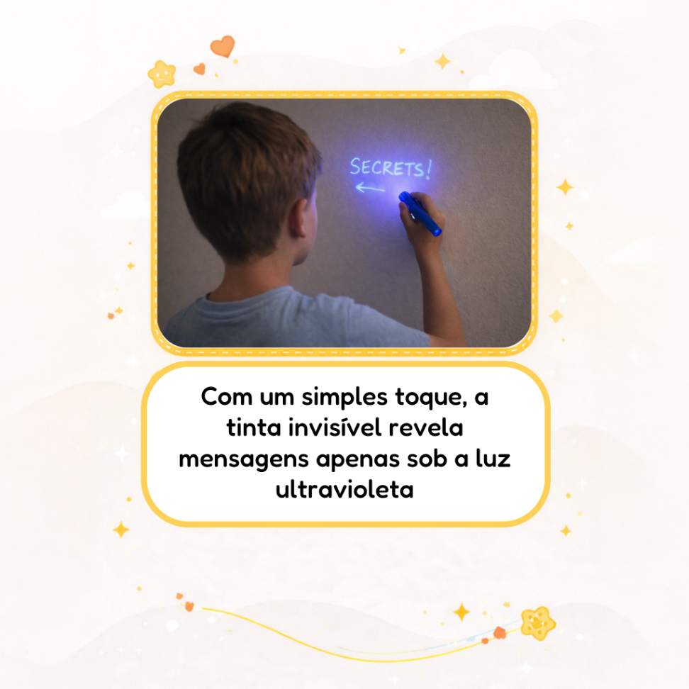 Transforme a brincadeira em uma missão secreta! A caneta de tinta invisível com luz UV é perfeita para crianças que adoram mistério, códigos secretos e jogos de imaginação.
