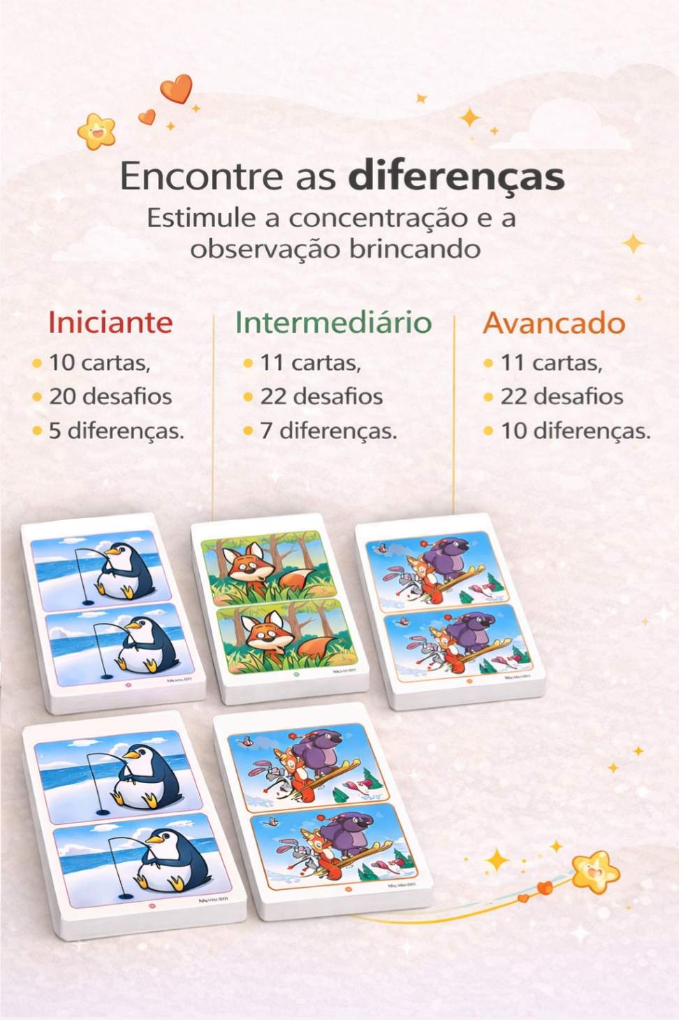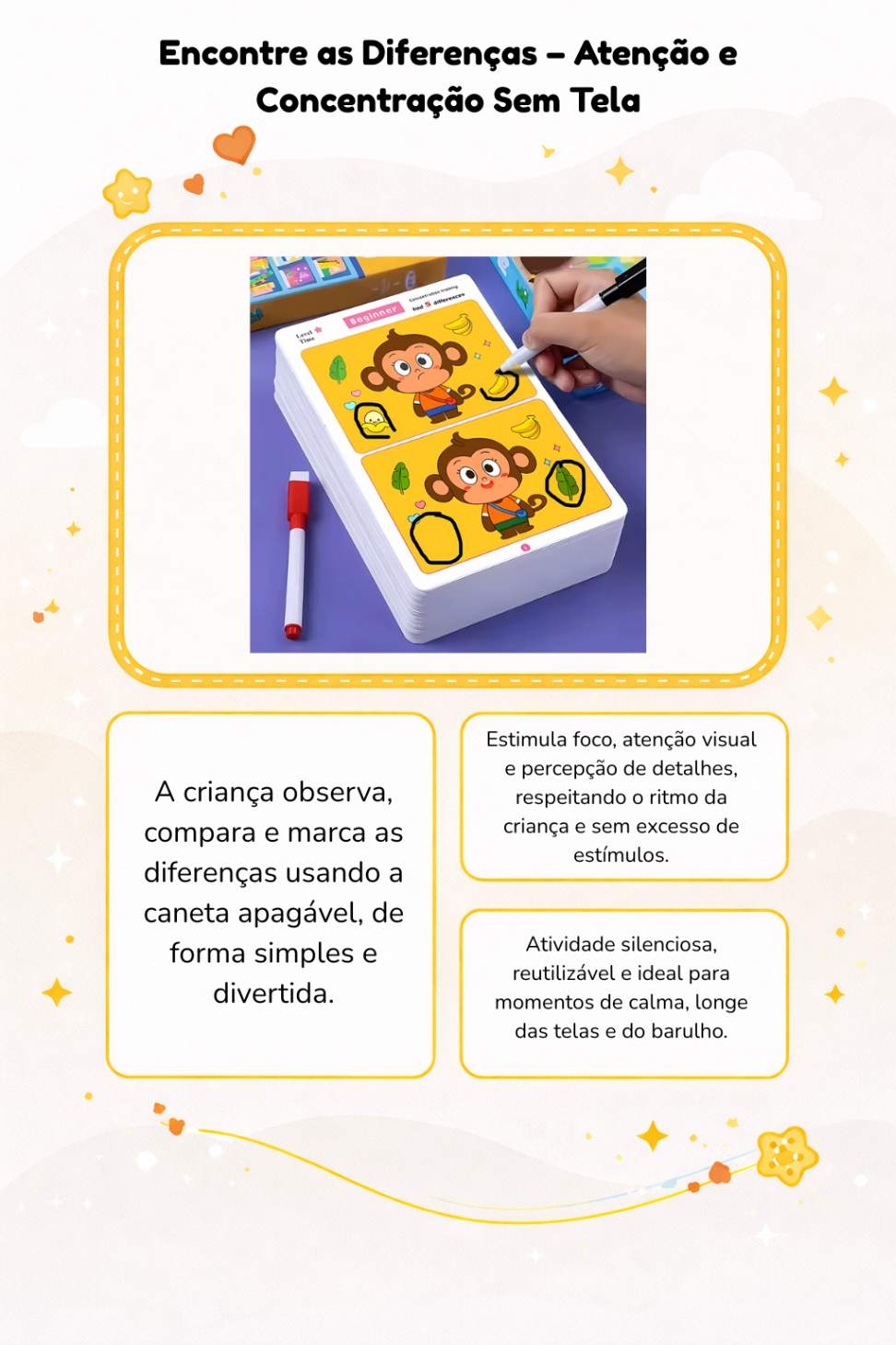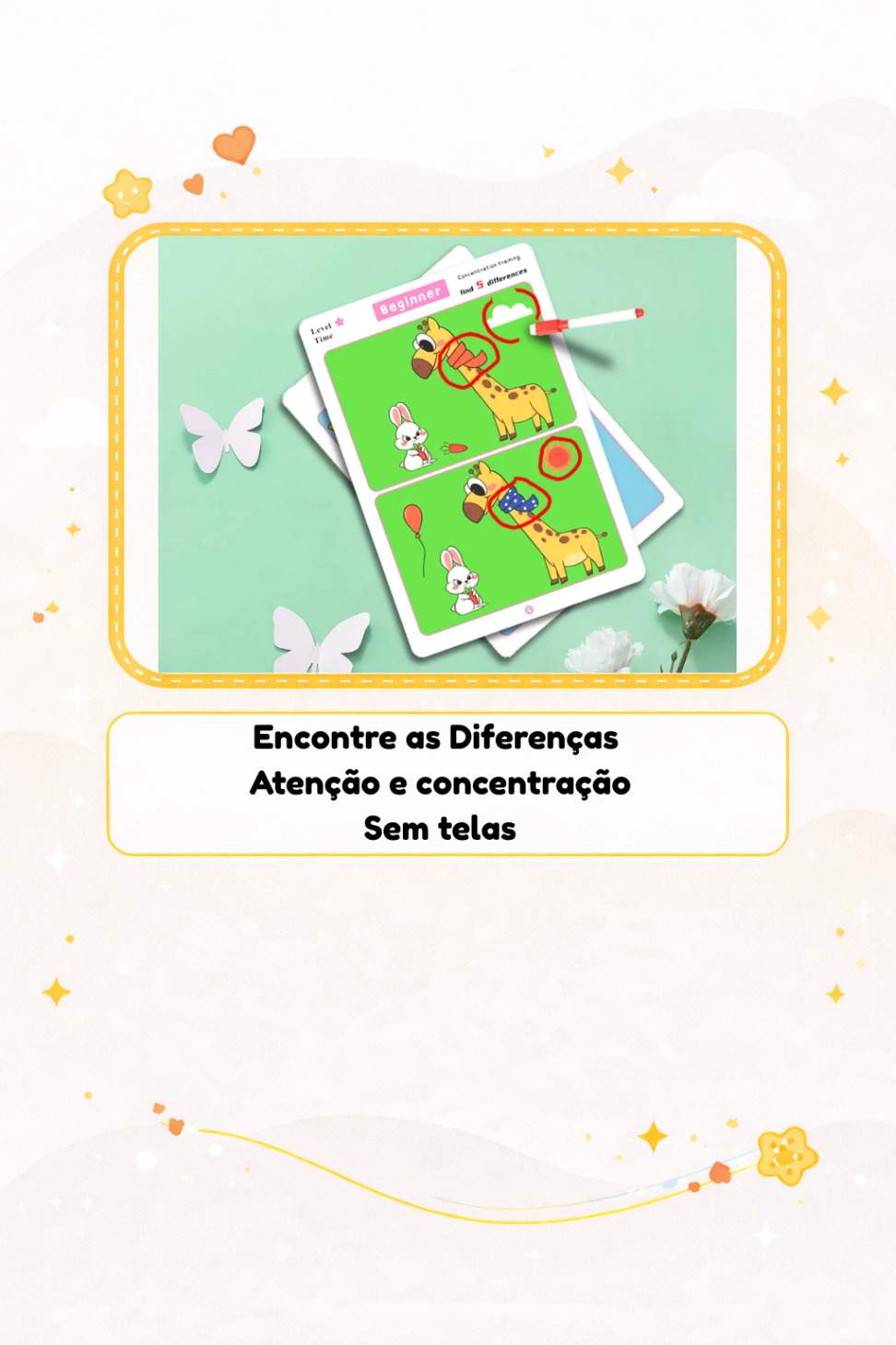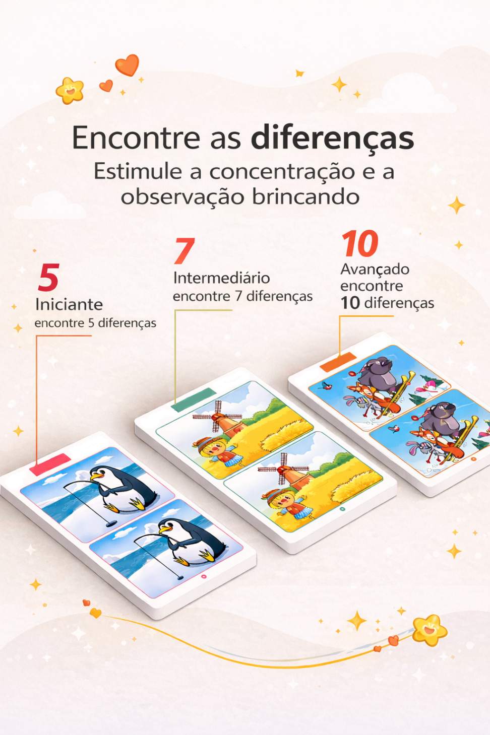 O Jogo Encontre as Diferenças foi pensado para estimular a concentração, a percepção visual e o raciocínio de forma leve, silenciosa e adequada à idade — ideal para momentos de calma, longe das telas.